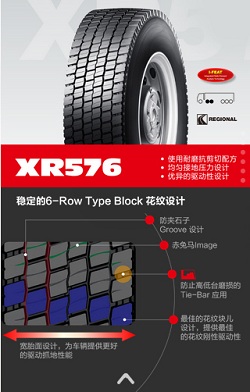 XR576使用耐磨抗剪切配方、均勻接地壓力設(shè)計以及優(yōu)異的驅(qū)動性設(shè)計,寬胎面的設(shè)計為車輛提供更好的驅(qū)動抓地性能。同時采用更加穩(wěn)定的6—Row Type Block花紋設(shè)計,包括防夾石子Groove 設(shè)計;赤兔馬Image;防止高低臺磨損的Tie—Bar應(yīng)用;最佳的花紋塊兒設(shè)計,提供最佳的花紋剛性驅(qū)動性。