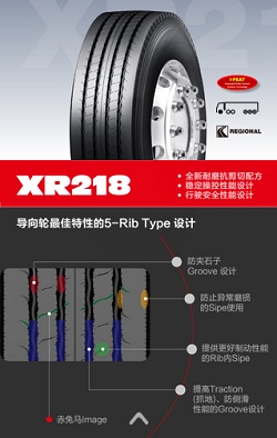 其中XR218采用全新耐磨抗剪切配方,更加穩(wěn)定的操控性能設(shè)計,以及保障行駛安全性能設(shè)計。其導(dǎo)向輪采用了最佳特性的5—Rib Type設(shè)計,包括防夾石子Groove設(shè)計;防止異常磨損的Sipe使用;提供更好制動性能的Rib內(nèi)Sipe;以及提高Traction(抓地)、防側(cè)滑性能的Groove設(shè)計。